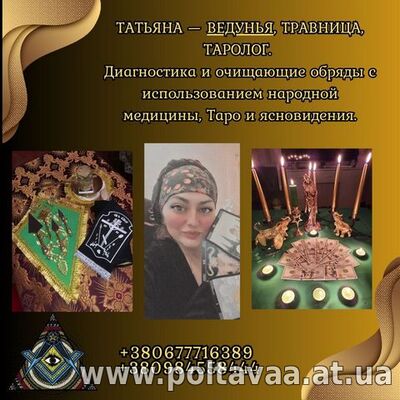 Ясновидящая и таролог. Гадание, магическая помощь, снятие порчи. Татьяна — специалист с большим опытом в сфере эзотерики, магии и траволечения. Она помогает людям восстановить здоровье, наладить ли